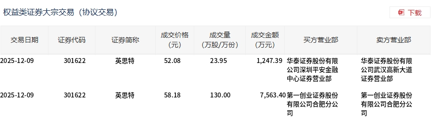 12月9日,英思特大宗交易成交153.95万股,成交额8810.79万元,占当日总成交额的50.52%,成交均价57.23元,较市场收盘价64.64元折价11.46%,其中最高成交价58.18元最正规的配资公司,最低成交价52.08元。