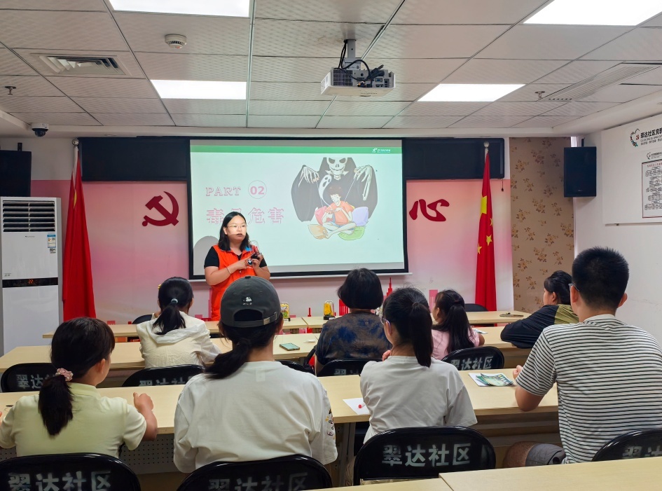 7月17日上午,香洲区翠香街道禁毒社工、钰海社区民警、钰海社区工作人员组织不同年龄段的青少年开展以“防范青少年药物滥用 守护绿色无毒青春”为主题的毒品预防知识讲座。